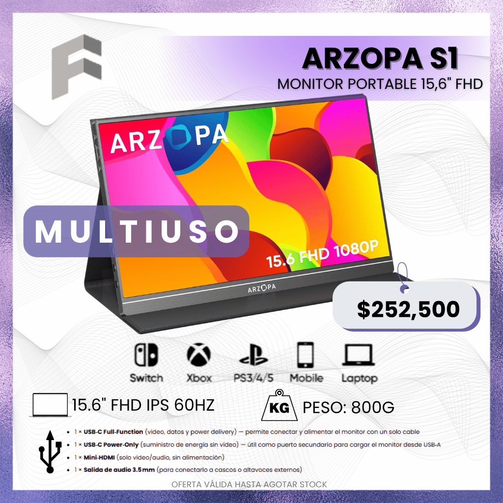 monitor portátil ARZOPA S1 de 15.6 pulgadas es la solución perfecta para quienes necesitan una segunda pantalla sin sacrificar movilidad. Su diseño ultra delgado y liviano lo convierte en el compañero ideal para profesionales, estudiantes, creadores de contenido y gamers que buscan expandir su espacio de trabajo o entretenimiento en cualquier momento y lugar.